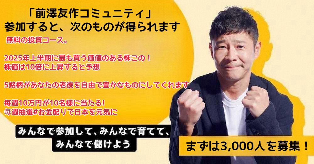 皆さんこんにちは、前澤 友作です 99%の人が気づいていないお金の正体 「貯める人ほどバカをみる!」 新時代の「稼ぎ方」と「生き方」 お金は、ただ手元に置いているだけでは増えません。 お金を増やすためには、しかるべき場所にお金を置く必要があります。 そうやってお金自体に働いてもらう必要があります。 つまり“投資"です。 株式市場で長期投資をするのが正解です。 早期退職を実現する真の解決策がここにある! 前澤 友作設立した無料の投資教室! LINEを追加すると無料の投資情報が手に入る!